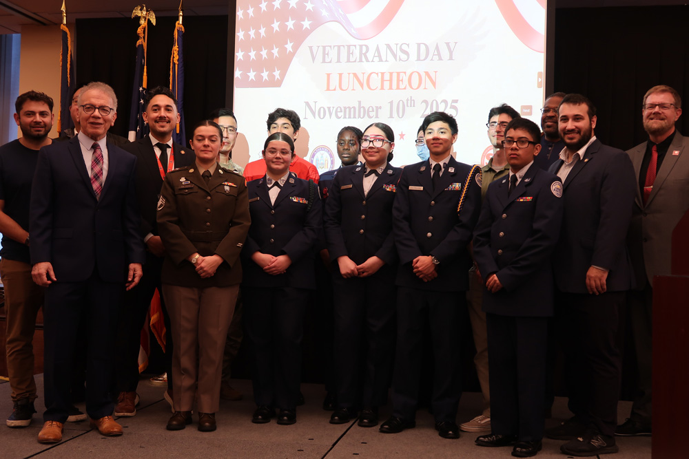 Veterans and students currently serving in the military were recognized at QC’s annual Veterans Day lunch, held on Monday, November 10. Urban Studies Distinguished Lecturer James Vacca (front row, far left) hosted the event; New York State Assembly Member Samuel T. Berger (front row, far right) and New York City Council Member James Gennaro were among the speakers.