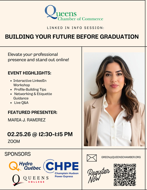 | | Chamber of Commerce To Hold LinkedIn Workshop | | The Queens Chamber of Commerce will present Building Your Future Before Graduation, a LinkedIn info session, on February 25, from 12:30 to 1:15 pm, over Zoom. The event, led by Maria J. Ramirez, will help students make the best use of the LinkedIn platform. Building Your Future Before Graduation is sponsored by Hydro Quebec, Champlain Hudson Power Express, and Queens College. Register here. |