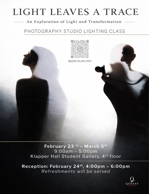 Light Leaves a Trace: An Exploration of Light and Transformation, an exhibition of photography by students in the fall and spring Studio Lighting courses, is now on display in the Klapper Hall Student Gallery, 4th floor. While Studio Lighting is required for everyone pursuing a Photography & Imaging BFA, some of the images in this show were created by psychology and design majors and graduate students in art education. Light Leaves a Trace will run through March 5.