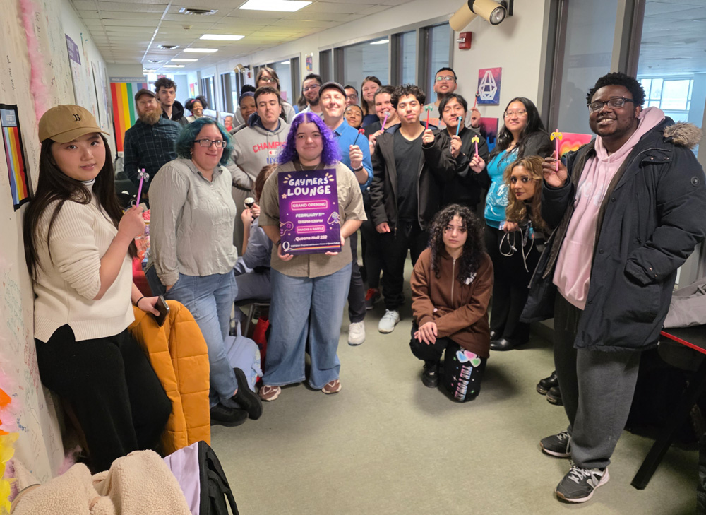 Discimus ut serviamus: We learn so that we may serve. | | Queens College will continue with remote work and learning operations on Tuesday, February 24, 2026. We will resume all in-person operations on Wednesday, February 25. | | With snacks, a raffle, and giveaways to the first 50 arrivals, the Gaymers Lounge—an inclusive space located in the LGBTQIAA+ Resource Center, Queens Hall Room 232—opened on February 11. Hanging out with old friends and making new ones, students enjoyed playing Mario Kart World, Super Smash Bros. Ultimate, Super Mario Party Jamboree, and more on the new Nintendo Switch 2 and gaming monitor. All are welcome at the lounge Monday through Thursday, from 9 am until 5 pm. | Students looking for an educational change of scenery explored their possibilities at the Study Abroad Fair on Wednesday, February 18. Options range from comparatively brief summer and winter sessions—for which there are no prerequisites—to semester- or year-long programs. For details and deadlines, visit the Study Abroad website. | | Lights were dimmed on February 18 when students donned free glow swag for Sex in the Dark: An Anonymous Q&A Forum, an annual event sponsored by the Office of LGBTQIAA+ Programs and Resource Center at Queens College, and the Mt. Sinai Sexual Assault and Violence Intervention (SAVI) Program in partnership with the CUNY LGBTQIA+ Consortium and the New York City Council. A panel of "sexperts" answered anonymously submitted questions about sex and relationships. The event was co-sponsored by Bellesa, the Queens College Gender, Love and Sexuality Alliance/GLASA, the Alliance of Latin American Students at Queens College, the Queens College Hispanic Club, Queens College Student Association, and the CUNY Office of Student Inclusion Initiatives with additional support from The AIDS Center of Queens County/ACQC, the Mt. Sinai Young Adult Sexual Services Program/YASS, Northwell Health, the LGBT Network, Pride for Youth, Project Rite, the NYC Condom Collective, and Pride for Youth/PFY. | From left: Queens Hillel Engagement Associate Michelle Hurtin, Queens Hillel Engagement Intern Emily Nisanov, an active community leader, Queens Hillel Student Leader Gabrielle Mark, and Queens Hillel Engagement Intern Binyamin Alter | A delegation from the campus chapter of Hillel represented QC at this year’s Queens Jewish Link Networking Expo on February 18. The event, held at Young Israel of Jamaica Estates, brought together business owners, rabbinic guides, educators, nonprofit leaders, young professionals, volunteers, and long-time community figures from across the borough. | | President Frank H. Wu spoke to QC alumni on Sunday, February 22, at a reunion that Vice President for Institutional Advancement and Alumni Relations Laurie Dorf and her team organized in Pompano Beach, Florida. | From left: Queens College Foundation Chair Chaim Wachsberger; alumni Naomi Mayer, Judith Skylar, and Henry Unger; Vice President for Communications and Marketing and Senior Advisor to the President Jay Hershenson; President Frank H. Wu | | Spring Season Gets Underway as Baseball Heads South | | The 2026 baseball season got underway this week, as the Knights traveled to Myrtle Beach, South Carolina for the first three games of the year. After they dropped their first two contests to Southern New Hampshire on Friday, the Knights rebounded to defeat local rival Adelphi University, 8-2, in their final game of the trip on Saturday. | | |