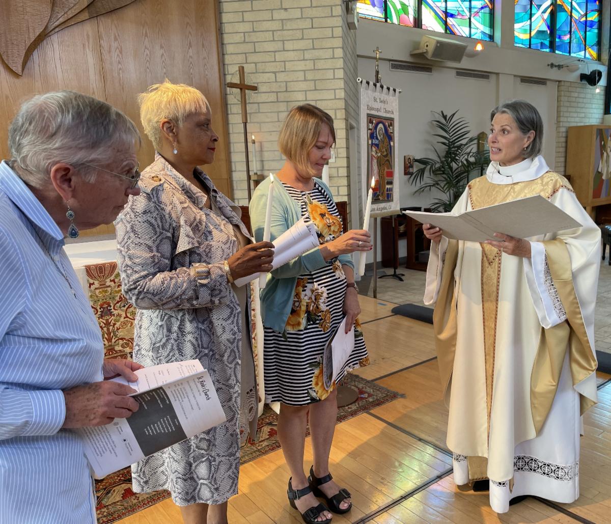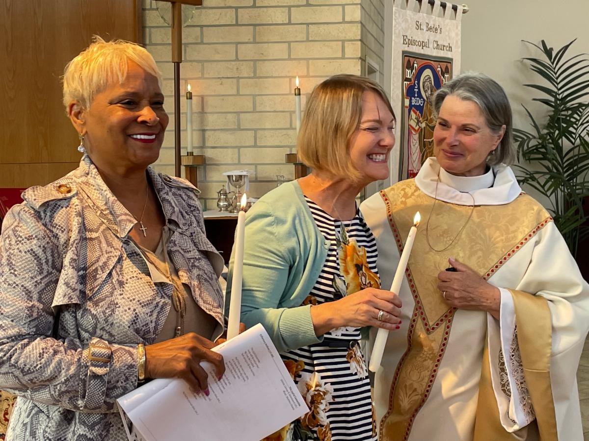 | | Daughters of the King President, Kathy Fairchild, looks on as Rev. Jennifer leads Stephanie Landry and Kelly Riggle-Hower in the Service of Preparation for Membership in The Order of the Daughters of the King. Photo: Penny Jennings | | The Daughters of the King (DOK) is an international Order for women who have taken a lifetime vow of service to God, to their church, and to daily prayers. The St. Bede’s church service on Sunday, May 4, included the Service of Preparation for Membership in The Order of the Daughters of the King. This special service provided Rev. Jennifer with the privilege of presenting Stephanie Landry and Kelly Riggle-Hower as candidates who were about to embark on the 12 weekly sessions required for entry into the Order. This series of sessions, which follow the DOK National Study Guide, helps prospective members explore their faith and learn about the Order. Each session asks challenging questions, stimulating reflection and discernment that can lead to spiritual growth, the deepening of faith, the strengthening of prayer life, and a growing commitment to serve God and church as we live out our Baptismal Covenant. | | Rev. Jennifer smiles at Kelly Riggle-Hower as she receives the candle that reminds her that Jesus Christ is the Light of the world. Photo: Penny Jennings | | | Rev. Jennifer gives Stephanie Landry the blessing of God Almighty, Father, Son and Holy Spirit to remain with her always. Photo: Penny Jennings | | | INVITATION to WOMEN of St. Bede's | | Sisters of Bede Meeting on Monday, May 5 - Front row: Daphne Moote (Chairperson), Tana Raikes (Secretary), Ina Klem, Susan Holder, & Mary Deutsche. Back row: Kathy Russell (Book Cart Coordinator), Bond Harper, & Penny Jennings (Treasurer). Photo: Lana Spraker | | |