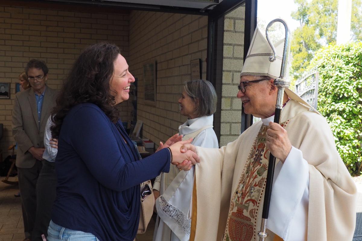 | | Bp. Little greeted the congregation after the service, including Vestry member Emily Mayock. Photo: Penny Jennings | |