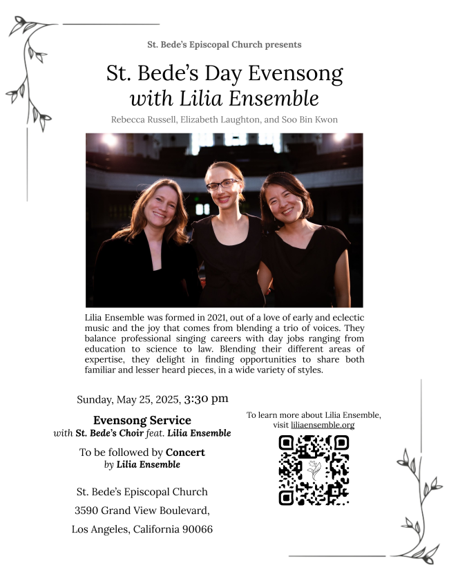 Sunday, May 25, 3:30 - 5:00 PM: Evensong with Lilia Ensemble in the Sanctuary (see flyer below)