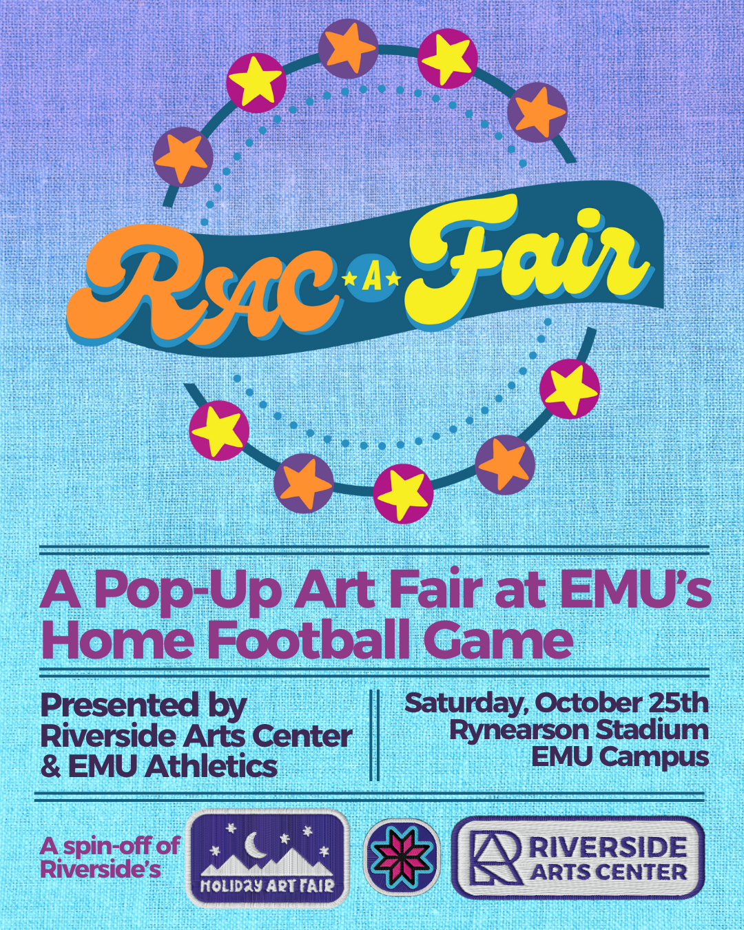 Riverside Arts Center is teaming up with Eastern Michigan University Athletics to present the first-ever RAC-A-Fair, a pop-up art fair during EMU’s home football game on Saturday, October 25, 2025.