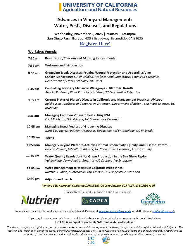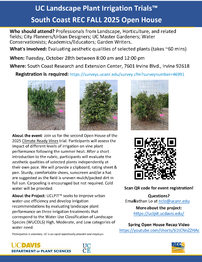 | | 3-part Forestry Webinar Series | | H2O for HOAs: Free Education and Networking Event | | UC Landscape Plant Irrigation Trials Fall Open House | | UCCE San Diego Vineyard Management Event | 4-H Youth Development Book Drive | | Join OC 4-H in our Fall Community Service Project: 1000 New Books Drive for CHOC Hospital Little Library, which provides books to patients and their families during their hospital stay. Until November 16, drop off NEW BOOKS ONLY in the box in Building 103 at South Coast REC. | | | | |