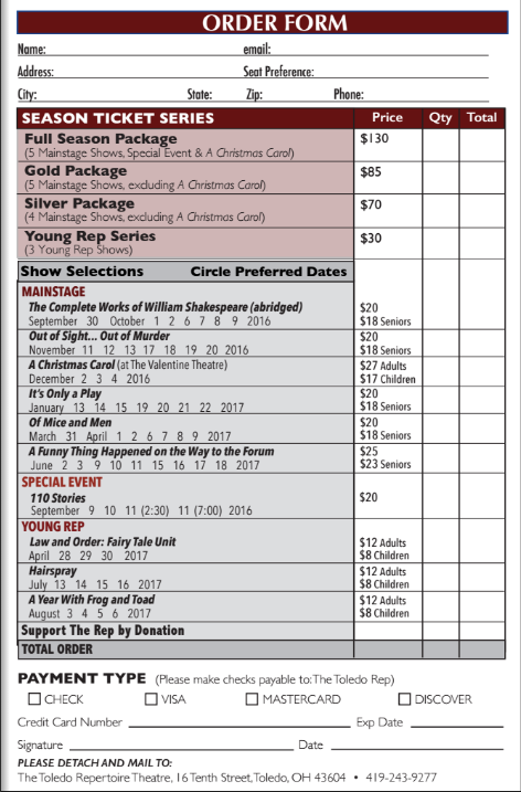 The Toledo Rep is looking for new Board and Committee members. Those wishing to serve should have a vested interest in The Toledo Rep and its continuation as a vital part of the cultural fabric of our community. The responsibilities for Board and Committee members are different. Due to bylaw guidelines, we have a limited number of Board seats. However, we have many more Committee positions available. If you should have an interest in either area, please complete the online form.