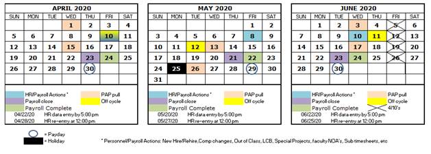 Like everyone, the payroll staff is working offsite. It remains their highest priority to ensure all employees are paid as scheduled. It is imperative that due dates be followed for April, May, and June. For timely payroll processing, please note: