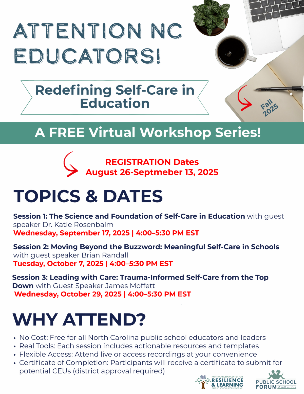 Grounded in the science of stress and regulation, this series is built for North Carolina PreK–12 educators, student support staff, and school/district leaders committed to fostering sustainable, inclusive, and system-supported wellness practices.