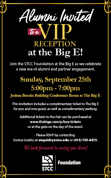 On behalf of Springfield Technical Community College and the STCC Foundation, we extend a special invitation to STCC alumni to join us for our 2022 VIP Reception held during the Big E on Sunday, September 25th.