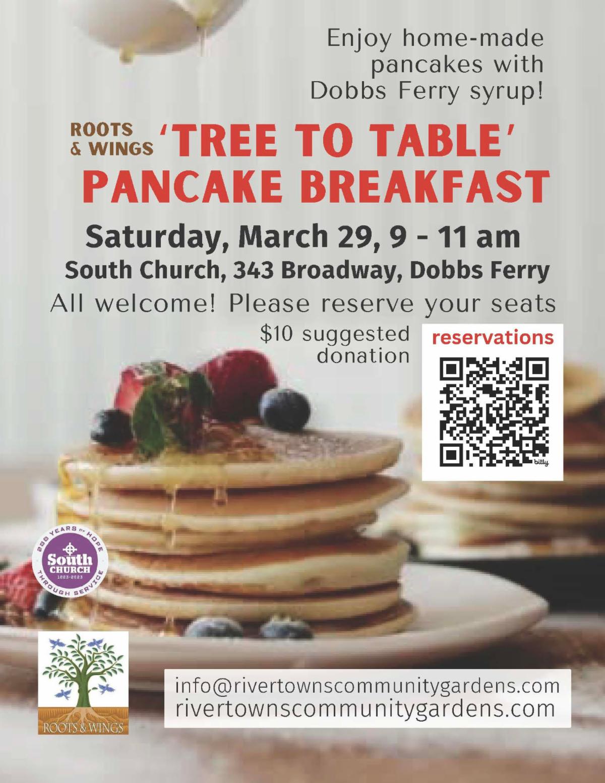 Sign up for one of three seatings 9:30am, 10:00am, and 10:30am by clicking here, so we can flip the right number of pancakes. If you'd like the vegan option, please note that, as well. Thank you to Booskerdoo, in Ardsley, for supplying the coffee. Proceeds benefit Roots & Wings sustainability initiative of South Church.