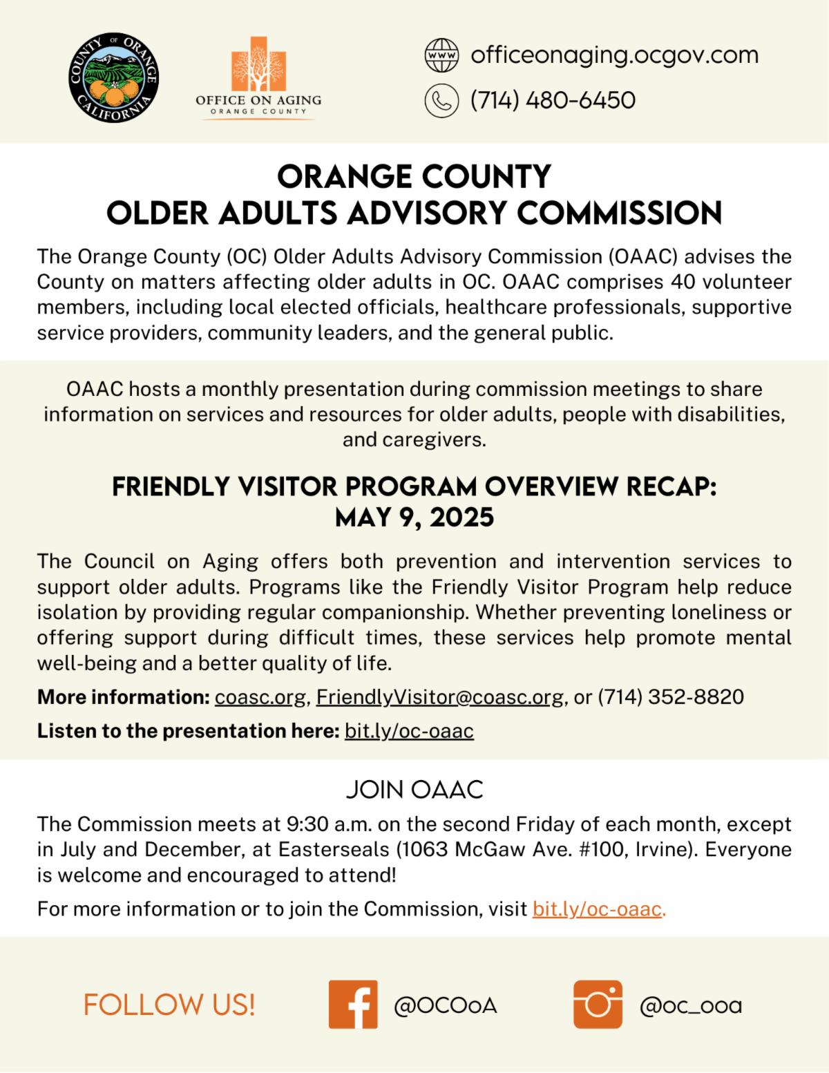 The Seal Beach Senior Services Summer 2025 guide is available online at https://www.sealbeachca.gov/Departments/Community-Services-Recreation/Senior-Services and at our community centers. This guide provides consolidated information for all available programs that the City offers for seniors. For any additional questions, please contact Nathan Caukin at (562) 431-2527 ext. 1307.