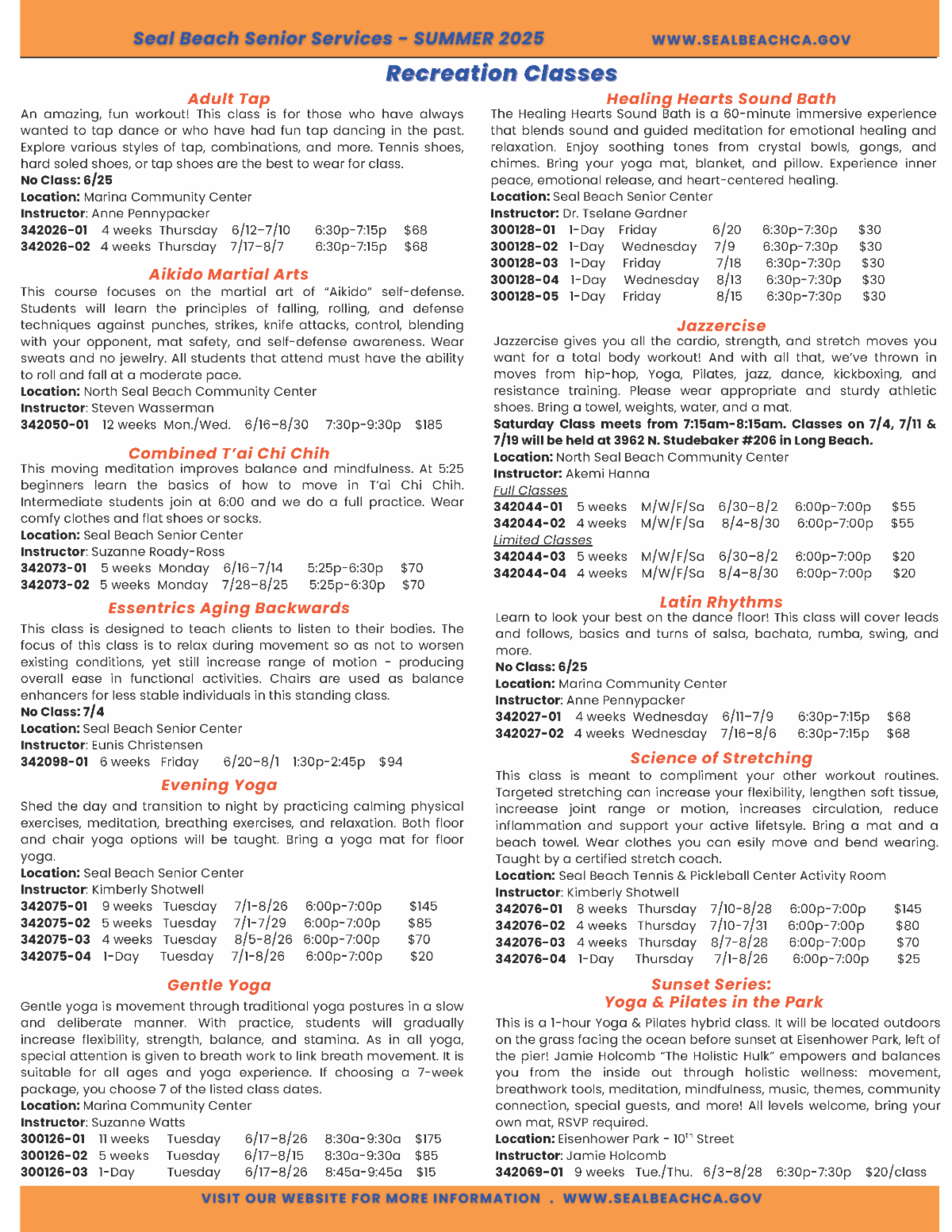 The Summer 2025 Shoreline Brochure is available on the City's website at https://www.sealbeachca.gov/Departments/Community-Services-Recreation/Recreation-Guide-Class-Info. This edition of the Shoreline includes information on summer camps, swimming lessons, dance classes, fitness classes, and much more! Viewers can click directly on the classes listed in the brochure and be taken to our online registration website.