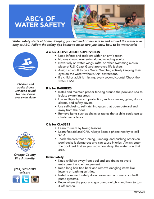 | | With warmer weather and schools out for summer, pool season is officially in full swing. OCFA has already responded to multiple drowning incidents this year, and we want to remind everyone that water safety starts at home. Whether you're heading to the beach, a community pool, or just relaxing in your backyard, it's important to stay vigilant. No one should ever swim alone. Children should always be supervised around water, free from distractions that could compromise their safety. Take a moment to review the ABCs of Water Safety flyer, which offers quick, life-saving tips to help keep you and your loved ones safe. Let’s make this summer fun, memorable, and most importantly, safe. | |