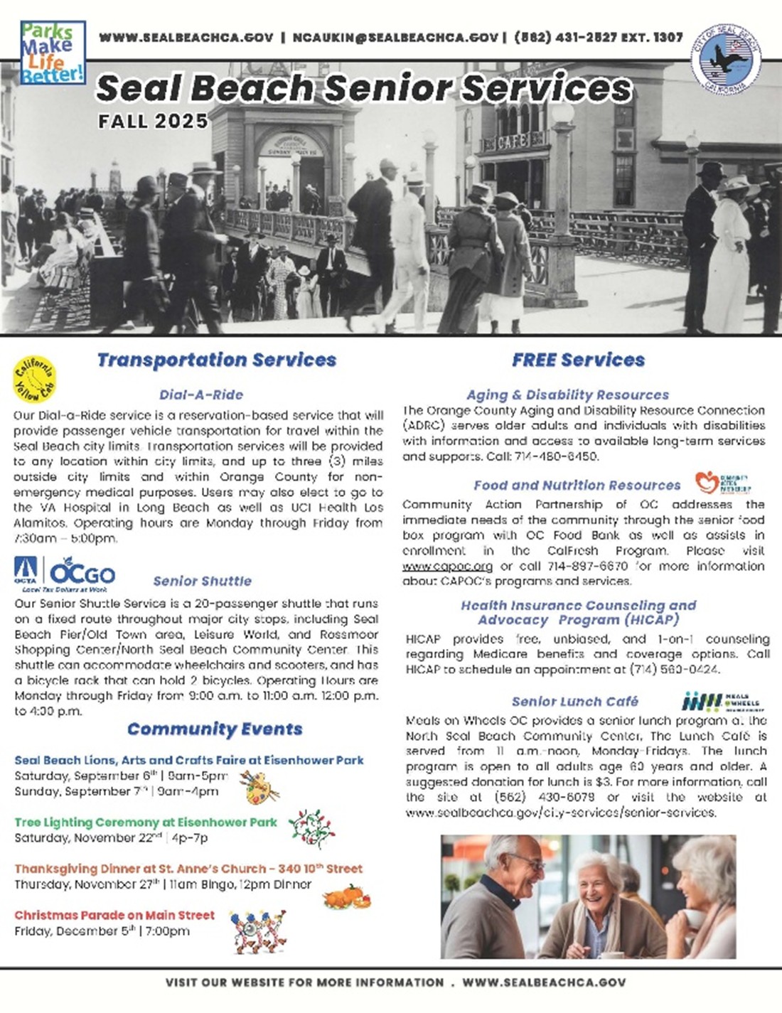 The Seal Beach Senior Services Fall 2025 guide is available online here and at our community centers. This guide provides consolidated information for all available programs that the City offers for seniors. For any additional questions, please contact Nathan Caukin at (562) 431-2527 ext. 1390.