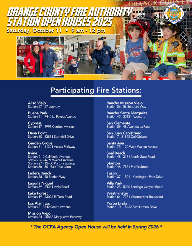 - Proclaimed October 5-11, 2025, as “Fire Prevention Week,” and urged Orange County residents to practice safe lithium-ion battery habits; to buy products that meet safety standards; to charge devices safely; to dispose and recycle batteries responsibly; and, to support public safety activities and efforts of the Orange County Fire Authority during Fire Prevention Week.