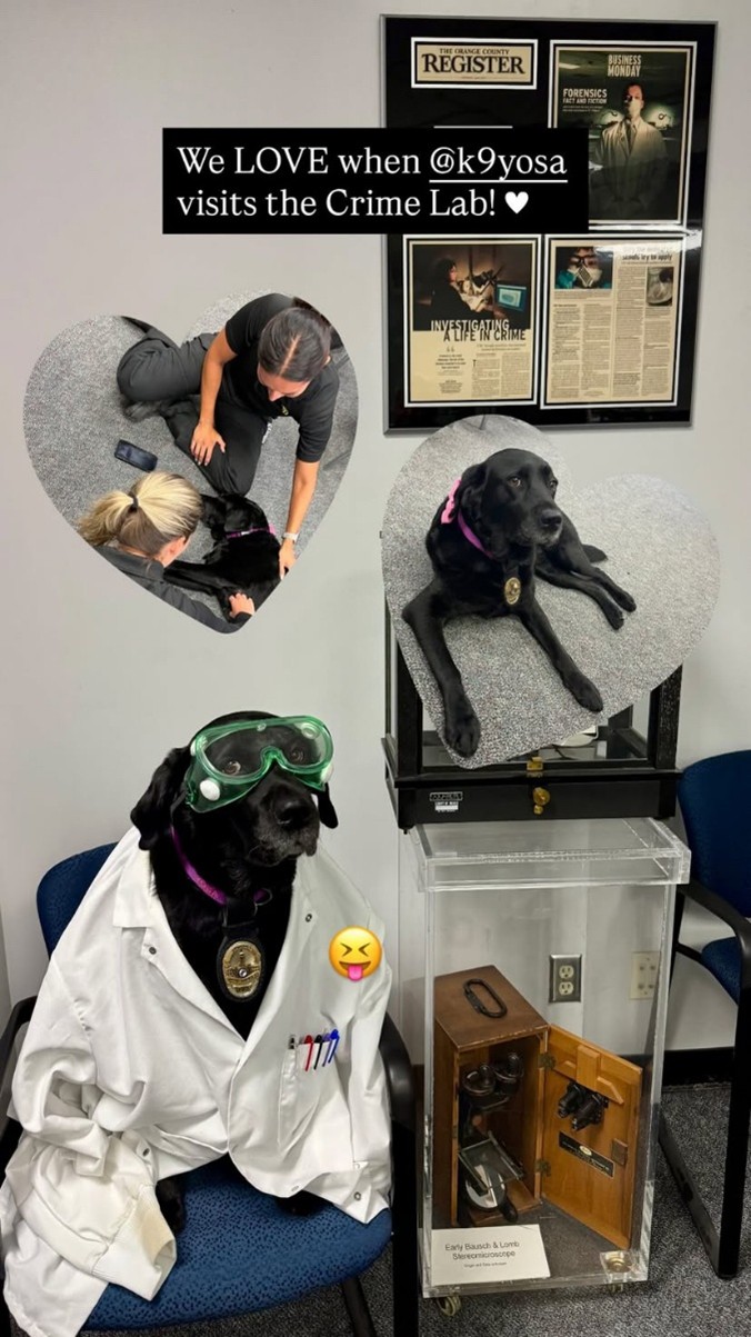 - Yosa visited the Orange County Crime Lab to celebrate Forensic Science Week, engaging with staff and highlighting how facility dogs support resilience, outreach, and inter-agency partnerships.