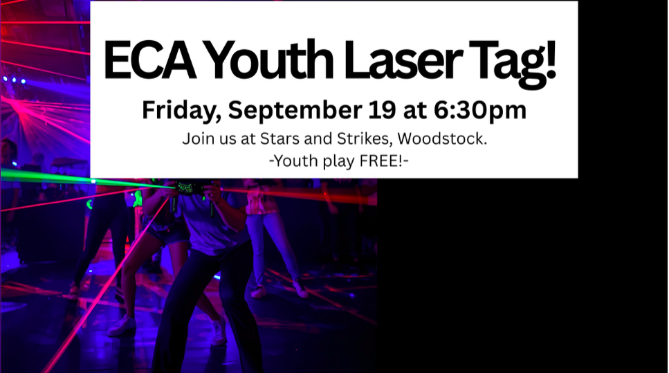 Youth Event This Friday! Laser Tag at Stars and Strikes All youth are invited to play Laser Tag at Stars and Strikes in Woodstock on Friday, September 19th at 6:30pm. Youth play free! Contact Lily Lippert to learn more.