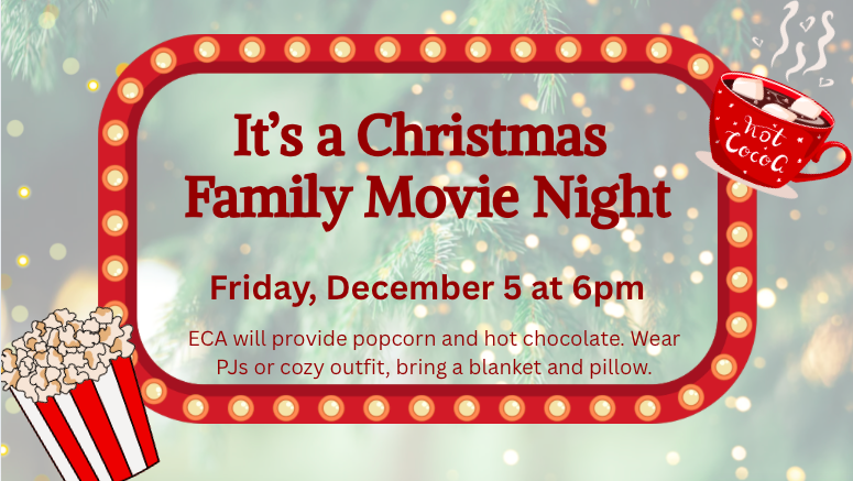 All ECA Youth, their family and guests are invited to a Family Movie Night on Friday, December 5 at 6:00pm. Wear PJ's or a cozy outfit and bring a blanket to enjoy a Christmas Movie! Contact Lily Lippert to learn more.