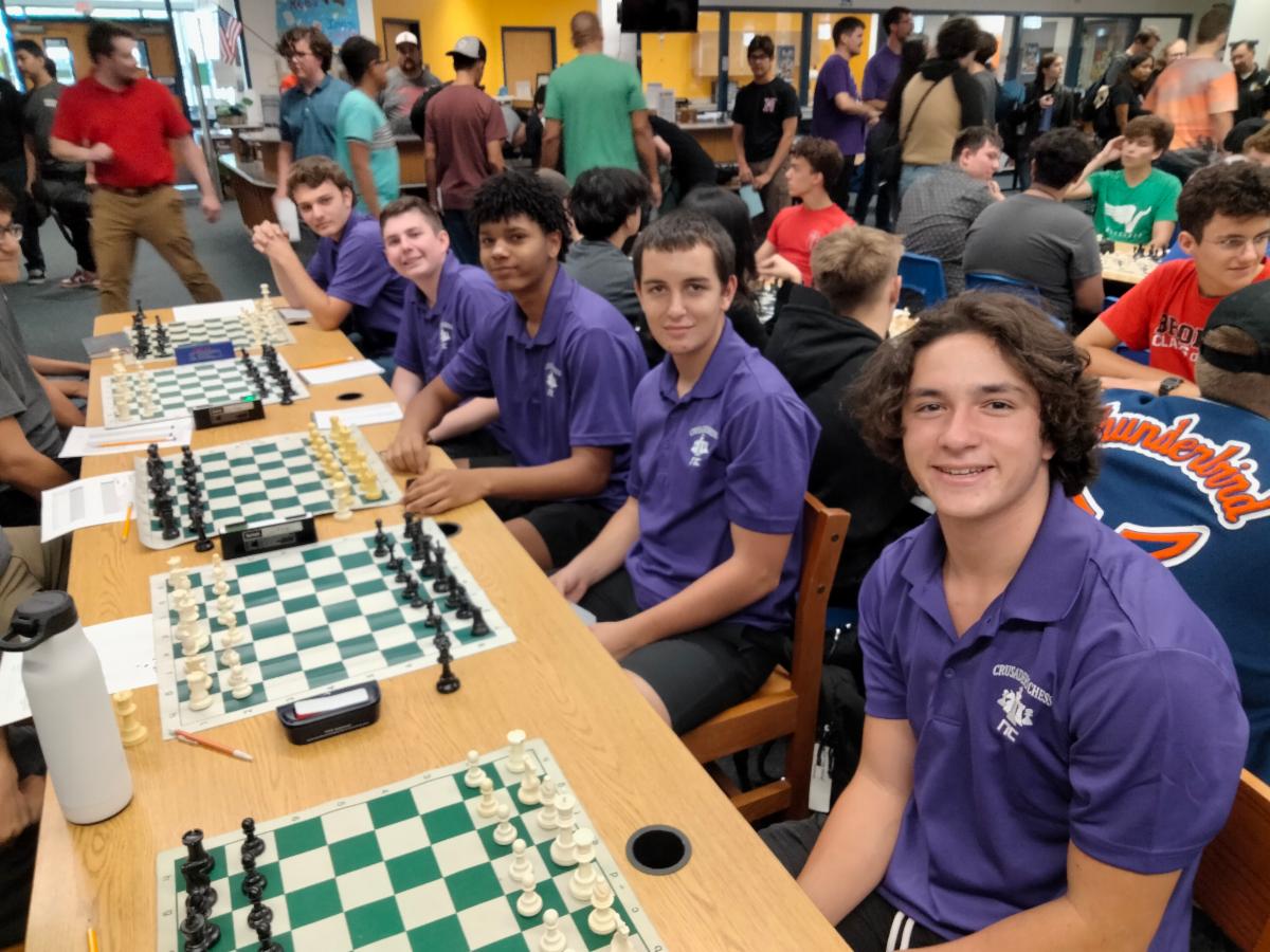 At long last, "Checkmate". History was made on Friday, August 25th, when five Crusaders, led by coach Brett Irwin, competed for the first time in Northwest Christian history in the Arizona Interscholastic Association's statewide high school chess league. After several years of on-campus chess clubs and school-sponsored tournaments at both the elementary and middle school divisions, Northwest Christian reached the crucial, critical mass of student interest necessary to support a high school team. During the first outing, the Crusaders bested Cortez High School and each member of the team notched at least one "checkmate" on the way to the victory.