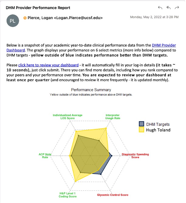 We have officially launched our Dashboard “Push” Reports, in which you will receive a snapshot of your year-to-date performance on 6 priority metrics (including 3 True North Metrics - Length of Stay, Interpreter Use, and ACP Documentation) in your email. The email contains personalized links, which will automatically log you into the dashboard (wait ~10 seconds for everything to fill in), where you can further explore your data, including your relative ranking, teaching wards vs. GMS performance, and performance over time. Please click on the links to auto log-in to the Dashboard - we expect all faculty to access their dashboard and review their data quarterly, which is how often these reports will be sent out.