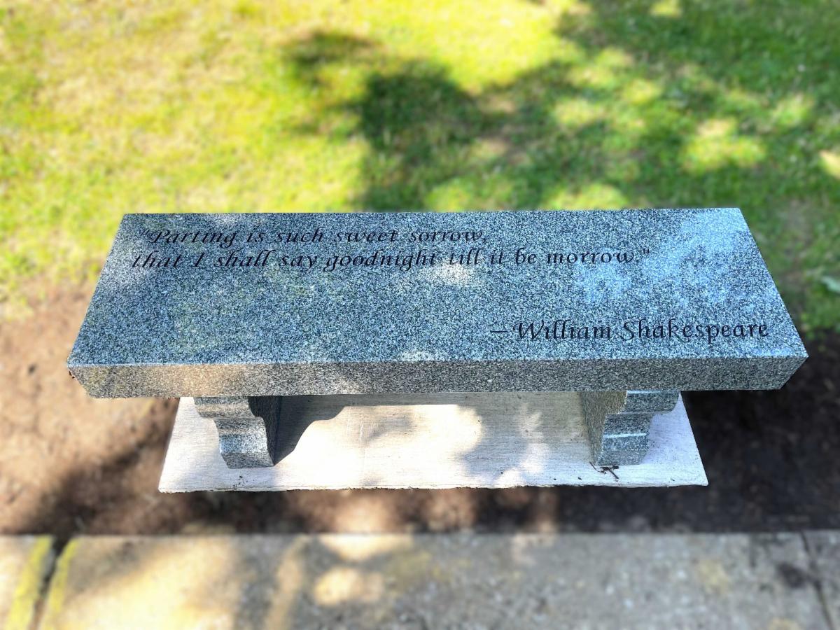 The Schaal Family generously donated two granite benches to Erie Day School in memory of beloved, retired English educator, Mrs. Virginia Rogers. Each bench is engraved with a quote reflecting her profound impact on students. One reads, "Parting is such sweet sorrow, that I shall say good night until it be morrow," a tribute to her passion for Shakespeare and her remarkable ability to inspire Middle School students to embrace his works. The other bench bears the quote, "To whom much is given, much is expected," a phrase Ginny was known to use in reminding students of the potential they hold.