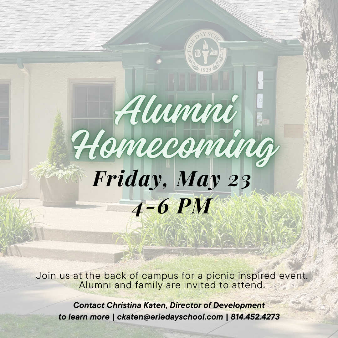 Mark your calendar and dust off your playground memories—it's time to come home to Erie Day School! Join fellow alumni, families, and friends for a joyful afternoon of connection and celebration at our Alumni Homecoming on Friday, May 23, 2025, from 4–6 PM.
