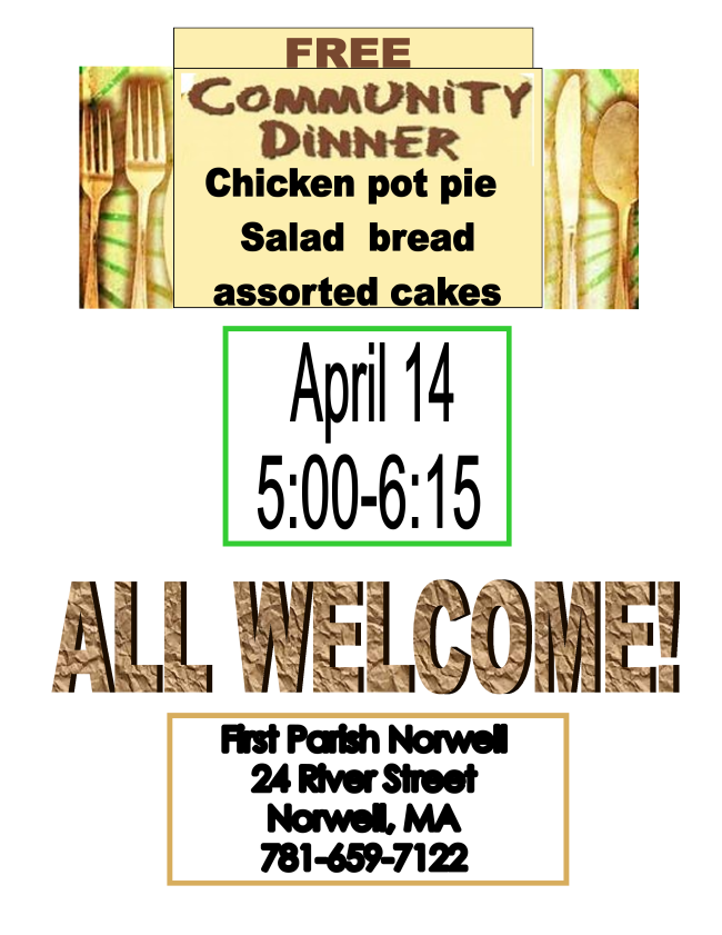 Join us at our next Community Dinner on Tuesday, April 14 from 5-6:15.