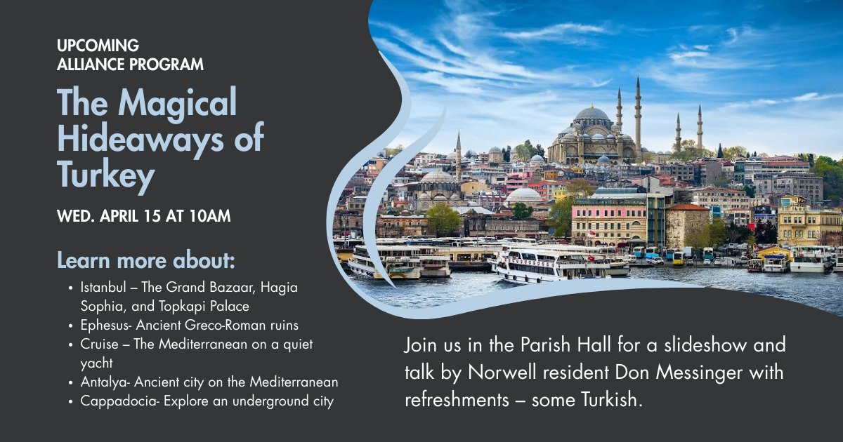 Join us in the Parish Hall for a slideshow and talk by Don Messinger of Norwell, refreshments (some Turkish) and this wonderful program. Hope to see you there!