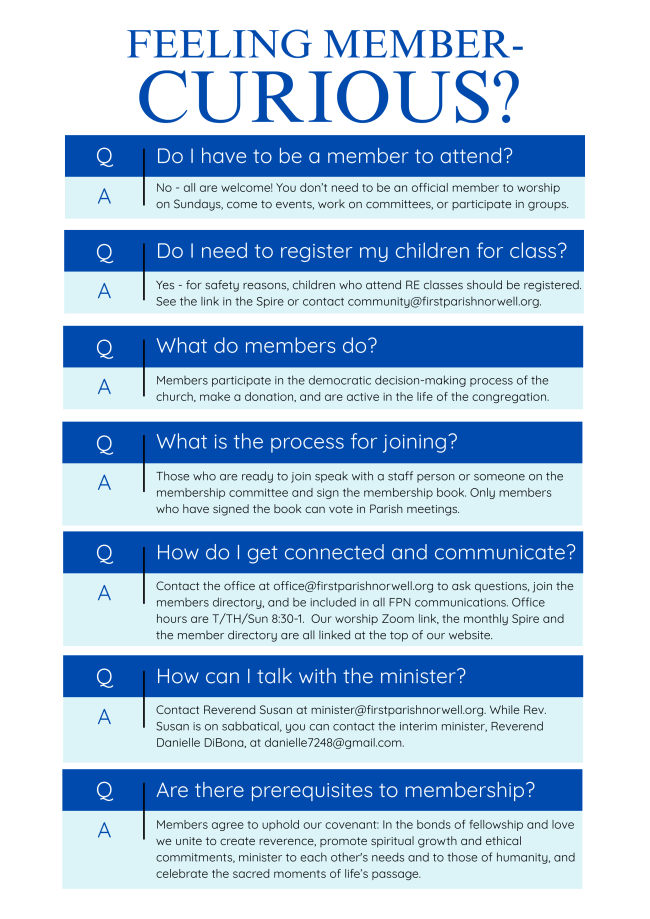 Our next gathering for new members/visitors is Sunday, April 12. These gatherings sponsored by our Membership Committee happen monthly in Fogg Parlor at 11:30am & provide a way for new and longtime members, friends and visitors to meet leaders in our congregation, learn what we are up to and how you can get involved.