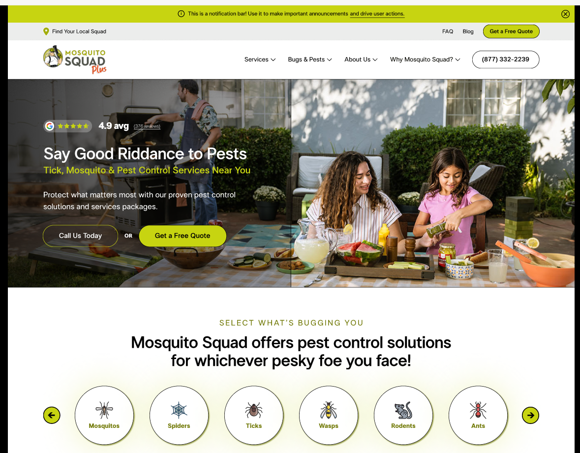 A reminder Mosquito Squad is launching a new website on January 15, 2025. The new website is redesigned to better position the many services Mosquito Squad now offers. Additional calls will present and outline how your local website can be used and customized to display the services your location offers. The goal of this website is to bring a new look and feel that allows the customization and resources we need to drive a better user experience and grow sales in 2025.