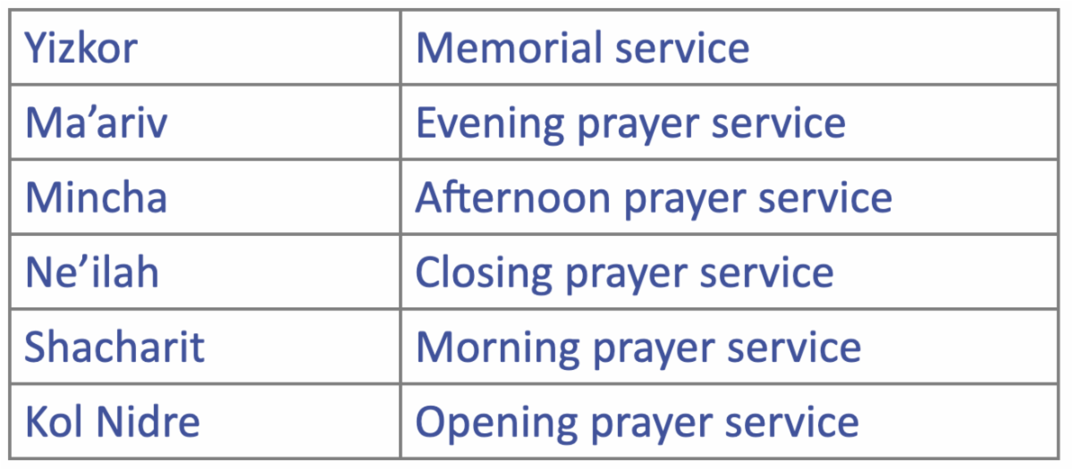 Yizkor is a memorial service that is included on Yom Kippur and other important days. The name appropriately derives from the Hebrew stem “Zakhor”, meaning “to remember”. Kol Nidre is the opening prayer of the first service on Yom Kippur. Kol Nidre means “all vows” because at this time we declare that all personal vows made to God in the preceding year are annulled, so we can start over again. Yom Kippur closes with the Ne’ilah service. This name comes from the Hebrew word “to lock,” referring to the symbolic closing of heaven’s gates and the “book of life”. Kol Nidre and Ne’ilah are prayer services that only occur on Yom Kippur.