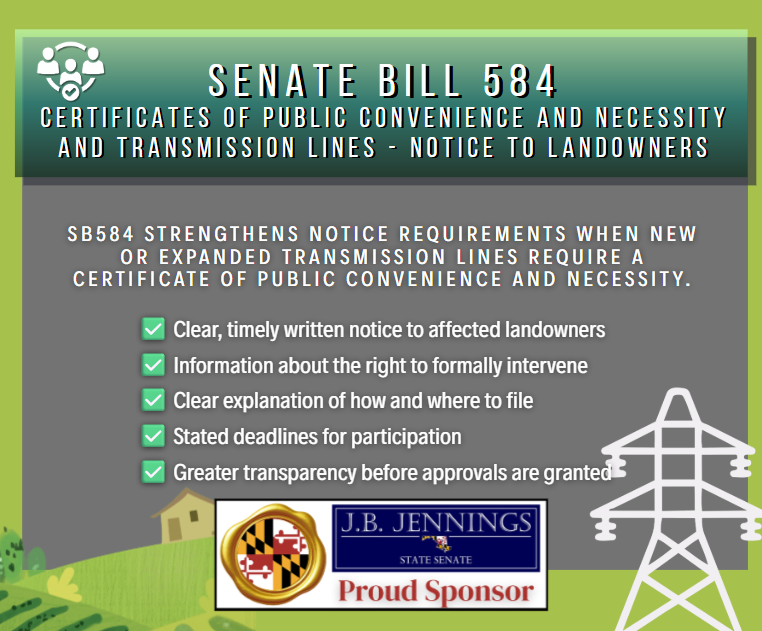 I'm proud to introduce Senate Bill 584 - Certificates of Public Convenience and Necessity and Transmission Lines - Notice to Landowners, which will be heard on Thursday, February 26, at 1:00.