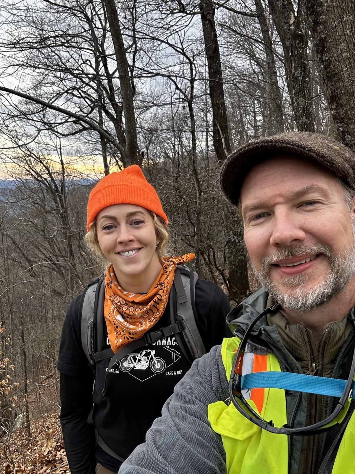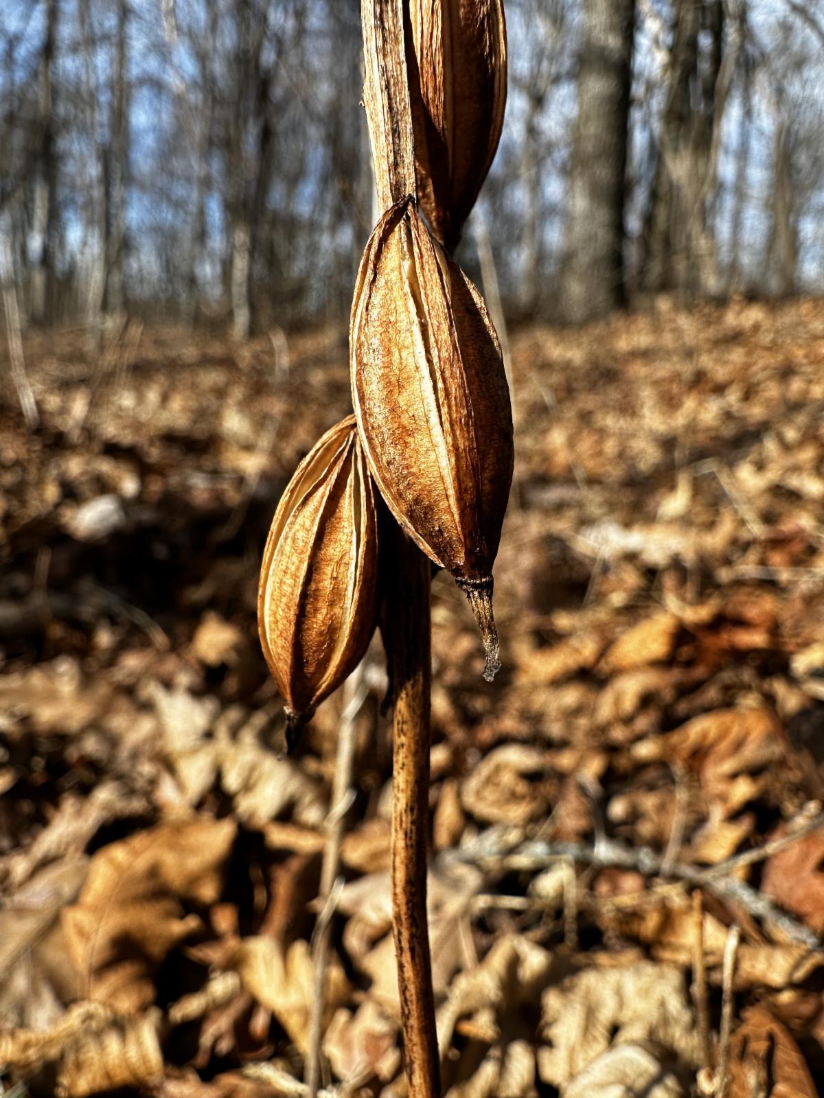 Before you go, enjoy some recent photos from the field | Dried capsules containing seeds of the putty root orchid (Aplectrum hyemale) | Lauren Ulich and Scott Park, UF's Glenn Hilliard Director of Land Conservation, enjoying this muted sunset while completing a baseline visit in northern Greenville County |