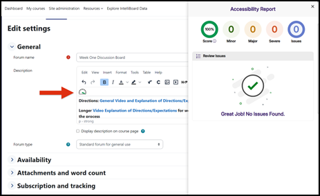 If you create content directly within Moodle with HTML, Panorama also offers a real-time accessibility gauge that will provide you with an accessibility report as you create your content. This will ensure you are creating accessible content from the start, saving time having to remediate later should a student need an accommodation, giving you more time to grade, am I right?