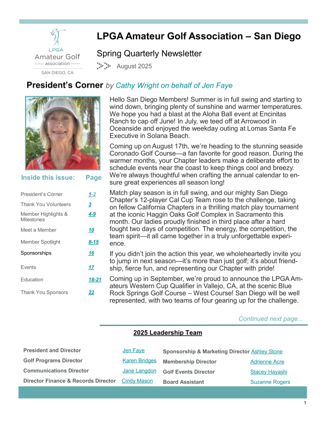 The LPGA Amateurs San Diego Chapter Summer Quarterly Newsletter is here. Please take a few minutes to read all about what is happening in our Chapter. Also, check out the events planned for the remaining season, meet our new members, and take the golf quiz. Please consider joining our Chapter and enjoy the community and fun golf outings.
