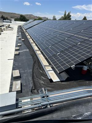The Carey High School roof is being upgraded from a TPO membrane that has leaked over the years. The solar panels are being lifted and the new membrane installed underneath.