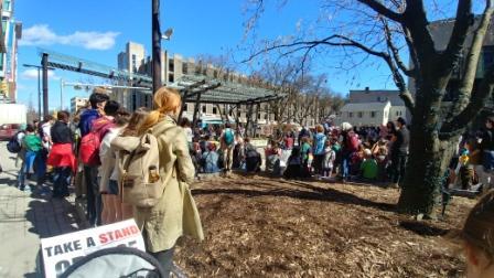 | Students rally on the Ithaca Commons as part of the global student climate strike on March 22. Photo by Peter Bardaglio. |