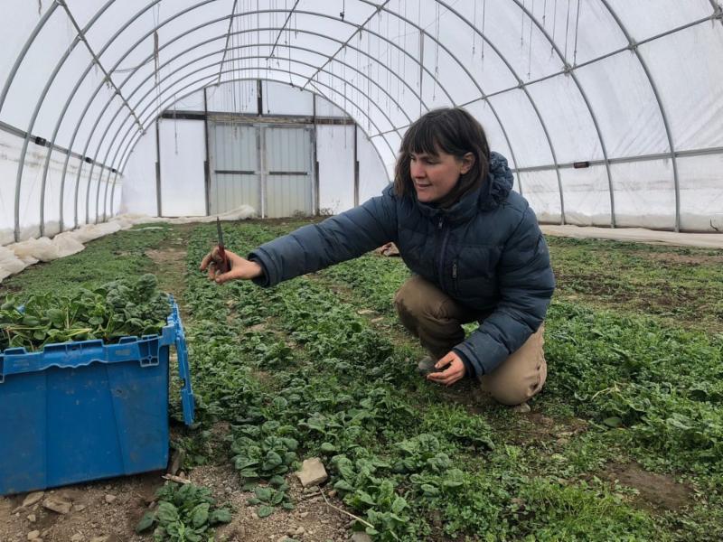 Lucy Garrison, one of the owners of Stick and Stone Farm, harvests spinach in one of the high tunnels on her farm. Photo courtesy of GYGB.