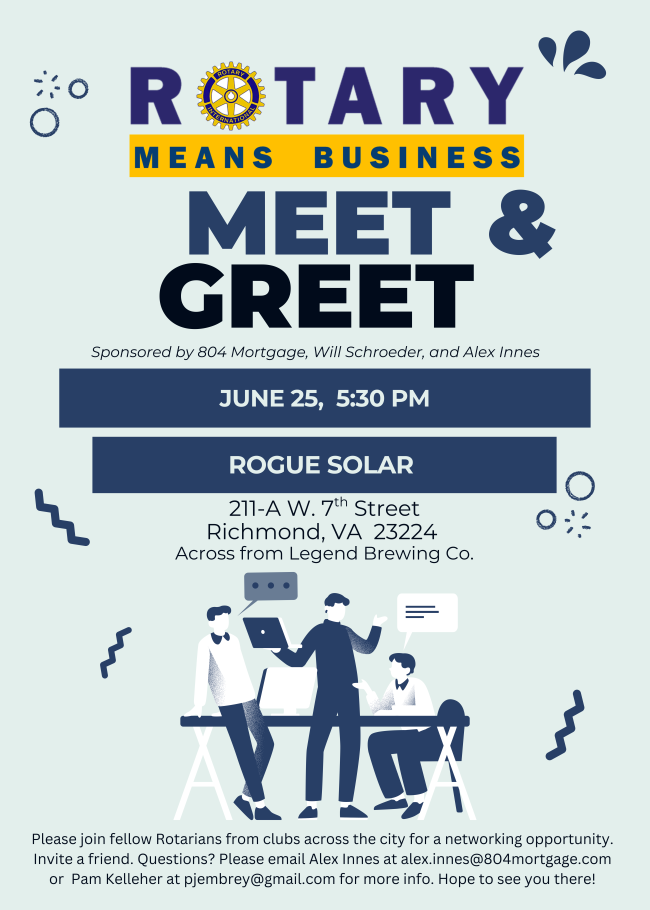Bring a friend and your business cards and join us for Rotary Means Business 5:30 to 7:30 pm, Wednesday, June 25th at Rogue Solar, 211-A W. 7th Street.  This Rotary Means Business is sponsored by 804 Mortgage, Will Schroeder, and Alex Innes.