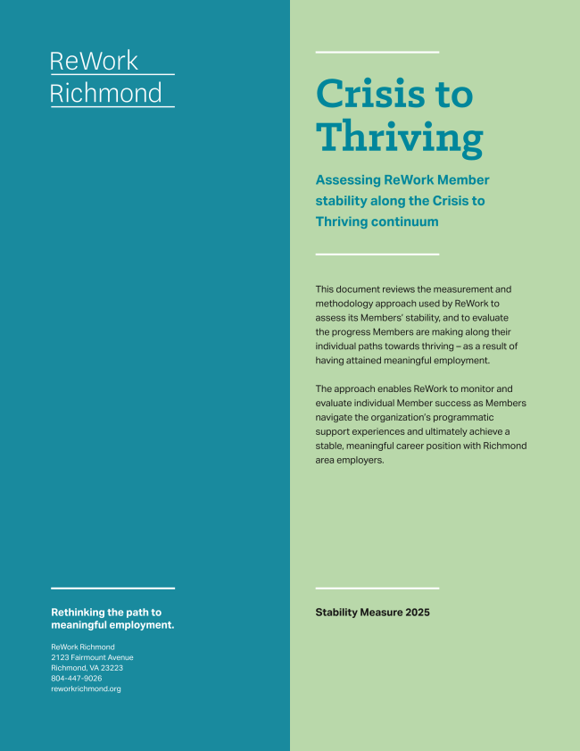 Take a moment to review the most recent Crisis to Thriving Report from ReWork Richmond. This document reviews the measurement and methodology approach used by ReWork to assess its Members’ stability, and to evaluate the progress Members are making along their individual paths towards thriving – as a result of having attained meaningful employment. The approach enables ReWork to monitor and evaluate individual Member success as Members navigate the organization’s programmatic support experiences and ultimately achieve a stable, meaningful career position with Richmond area employers.