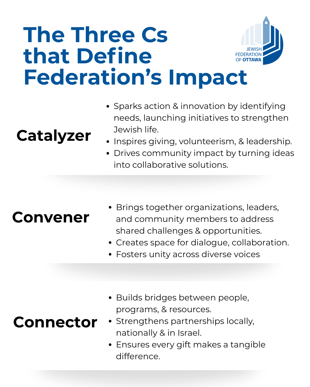 Of course, none of the above can happen without your ongoing support of Federation’s Annual Campaign. When you receive a call or email from one of Federation’s tireless Annual Campaign canvassers, I encourage you to remember the three “C”s and make a meaningful contribution to the betterment and continuity of our Ottawa Jewish community. You can also make your pledge online. If you have already made your pledge or donation, Todah Rabah!