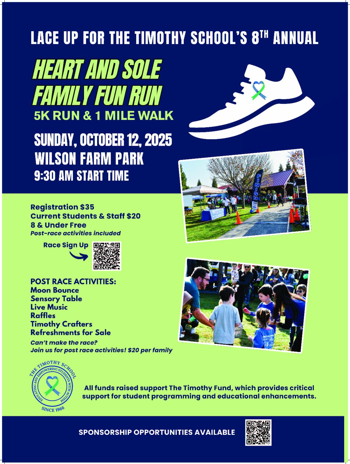 Join us on Sunday, October 12, 2025 at Wilson Farm Park for The Timothy School’s 8th Annual Heart and Sole Family Fun Run! The 5K run and 1-mile walk brings our community together in support of The Timothy School and our amazing students.