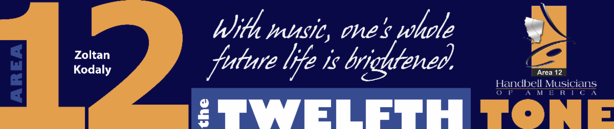 The Twelfth Tone is published on or around the first of each month, except July, by Area 12 of the Handbell Musicians of America (The Guild). The Guild is a non-profit organization dedicated to advancing the musical art of handbell/handchime ringing through education, community, and communication. The editor of this publication reserves the right to reject or modify copy.