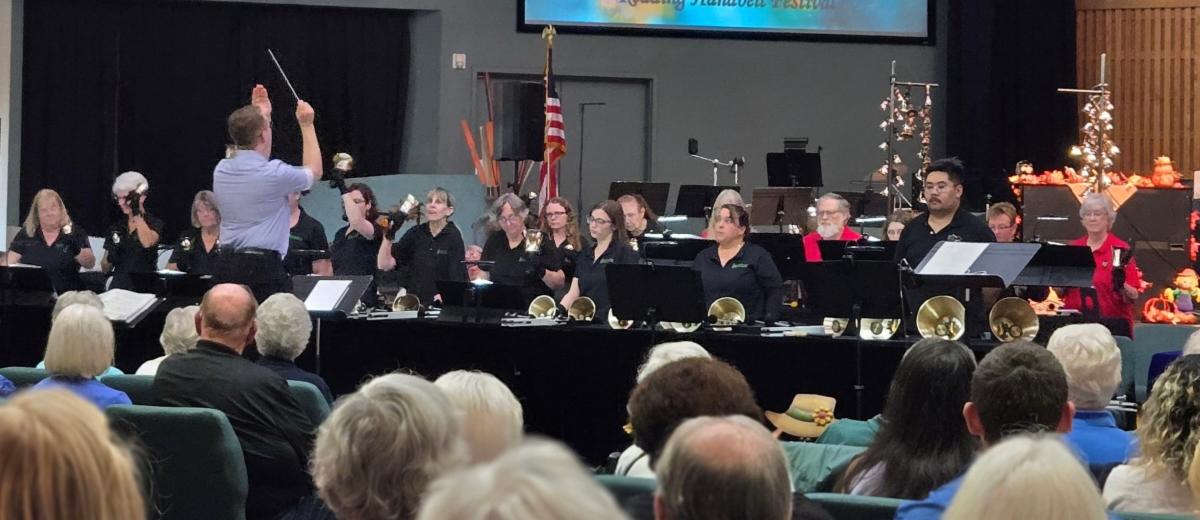 40 ringers had fun ringing at the Redding Handbell Festival held on October 18. The day was filled with ringing, classes, and a concert. Bell choirs and individuals from California, Nevada, and Washington came together to ring under Matthew Compton for the second time in two years. What a delight it was to have Matthew back! His patience and explanations of the songs truly brought out the musicality of the ringers. A brass choir accompanied the song Andante Maestoso and violin and cello accompanied the song Momentary, one of Matthew Comtton’s songs where he reminds us “that all things good and bad are essentially momentary. How we respond to these situations is what helps us grow into better people.”