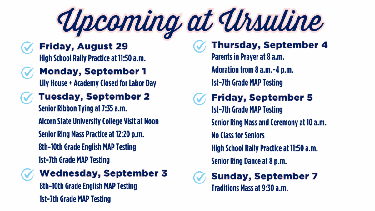 | | Senior Ring Dance l Friday, September 5 | | Don’t miss this special evening of memories, dancing, and celebration! | | Traditions Mass l Sunday, September 7 | |