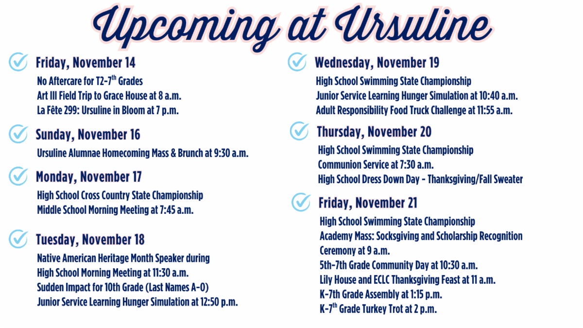 Click here to read past issues of The Ursuline Update! | | Important Scheduling Reminder | As a reminder, there will be NO Aftercare today, Friday, November 14, for T2-7th grades due to La Fête 299: Ursuline in Bloom. High School students must be off campus by 4 p.m. | | Good luck to Ursuline's Cross Country and Swim Teams, who will be competing in their respective State Meets next week. | | |