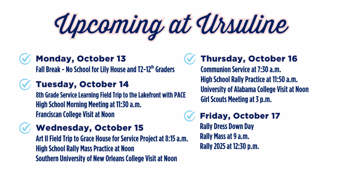 The application is open here and requires a $50 deposit via check made out to Ursuline Academy to save your spot. For any questions, please email Campus Minister Ms. Beth Joubert at bjoubert@uanola.org.