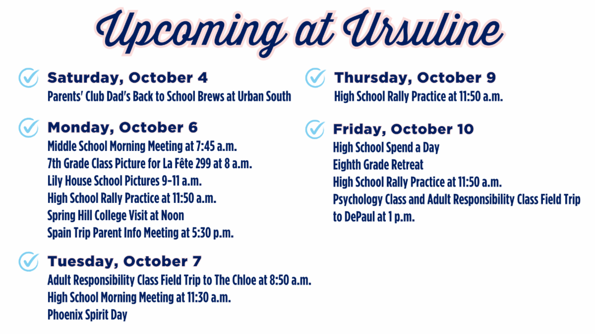| Sacrament Preparation at Ursuline Academy | We are excited to once again be able to offer preparation classes for second-grade students to receive their First Reconciliation and First Holy Communion at the National Votive Shrine of Our Lady of Prompt Succor. Preparation classes will be taught by Sarah Gunn and Christy Zurcher weekly after school in the Spring Semester. First Reconciliation will be on Saturday, February 28. First Communion will be on Sunday, April 26. If you would like your daughter in second grade to be prepared and receive her sacraments here, please complete the form linked below. | The deadline to register for sacraments is Friday, October 10. | 25-26 Work Study Opportunities | The Work Study Job sign-up is now open for the period from September 2 - November 21. To sign up for a job, please visit the link here. Please contact the Business Office at business@uanola.org if you have additional questions about work study. Non-work study families can volunteer via this form as well. Many hands make light work! | | Mark Your Calendars for Parents' Club Events This Fall! | |