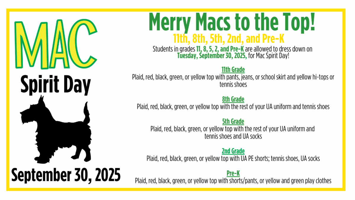 | | Girls' Night Out l Saturday, September 27 | All 5th-7th-grade girls are invited to join us on State Street on Saturday, September 27, from 5:30-8 p.m. We’re throwing the grooviest party at our house on State Street! Grab a friend and boogie on over to Ursuline for a girls’ night filled with fun games and activities, a chance to explore campus, and learn about what it means to be part of a sisterhood filled with love, peace, and soul! | Mac Spirit Day l Tuesday, September 30 | Pink Game l Wednesday, October 1 | |