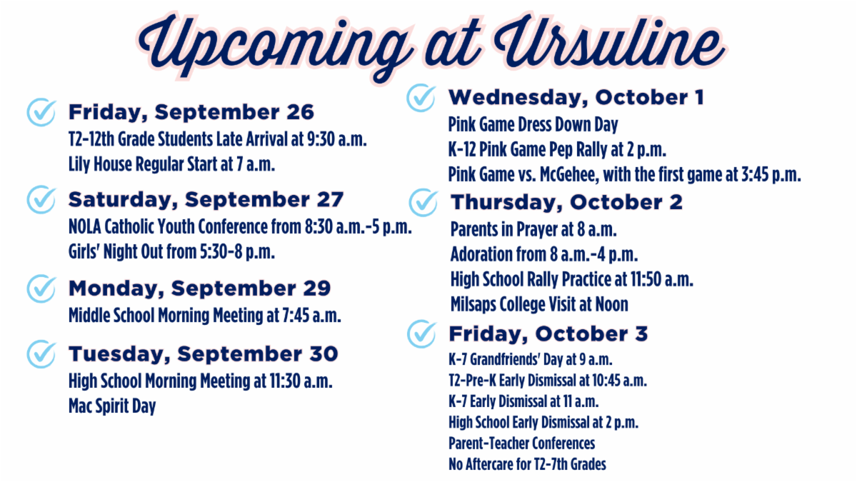 | | For all resources for the 2025-2026 school year, please bookmark this page. | | Sacrament Preparation at Ursuline Academy | We are excited to once again be able to offer preparation classes for second-grade students to receive their First Reconciliation and First Holy Communion at the National Votive Shrine of Our Lady of Prompt Succor. Preparation classes will be taught by Sarah Gunn and Christy Zurcher weekly after school in the Spring Semester. First Reconciliation will be on Saturday, February 28. First Communion will be on Sunday, April 26. If you would like your daughter in second grade to be prepared and receive her sacraments here, please complete the form linked below. | 25-26 Work Study Opportunities | The Work Study Job sign-up is now open for the period from September 2 - November 21. To sign up for a job, please visit the link here. Please contact the Business Office at business@uanola.org if you have additional questions about work study. Non-work study families can volunteer via this form as well. Many hands make light work! | | Thank you for another roaring success! Our Lions and Leis Mane Event at City Park was filled with spirit, smiles, and community pride. The Ursuline community is truly like no other—we’re so grateful to everyone who joined us and made the day unforgettable! | | Parents' Club September Meeting Notes | |